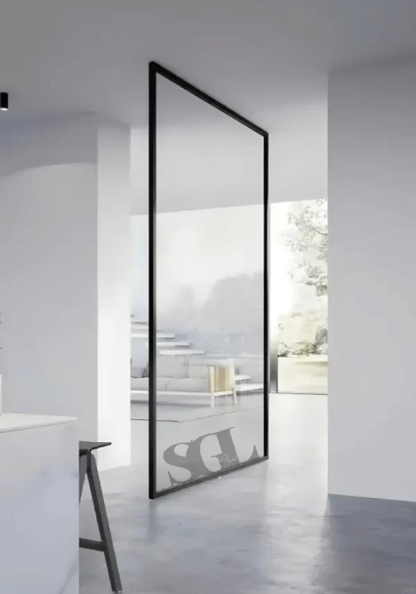 Minimalism pivoted door embodies the minimalist philosophy by eliminating unnecessary details, focusing on functionality and simplicity.